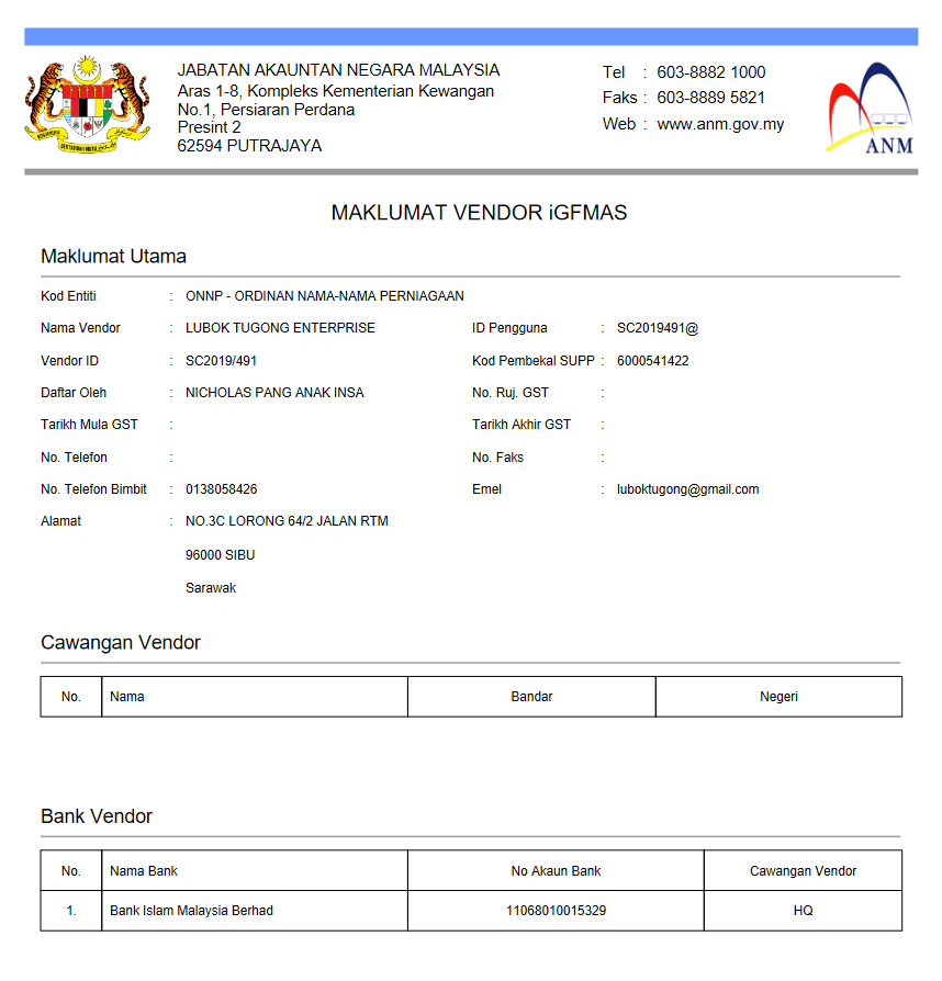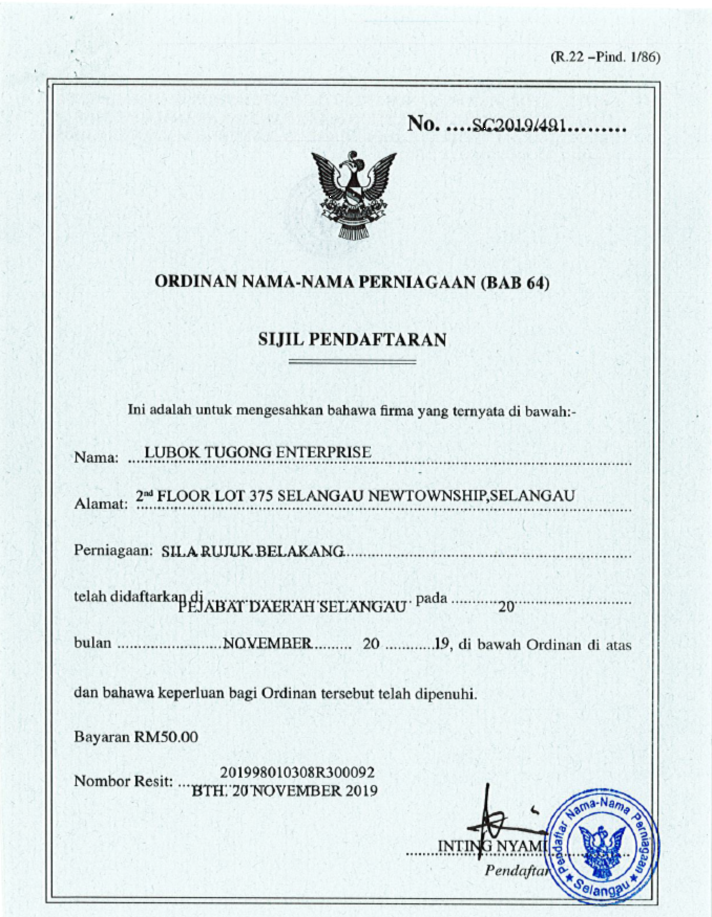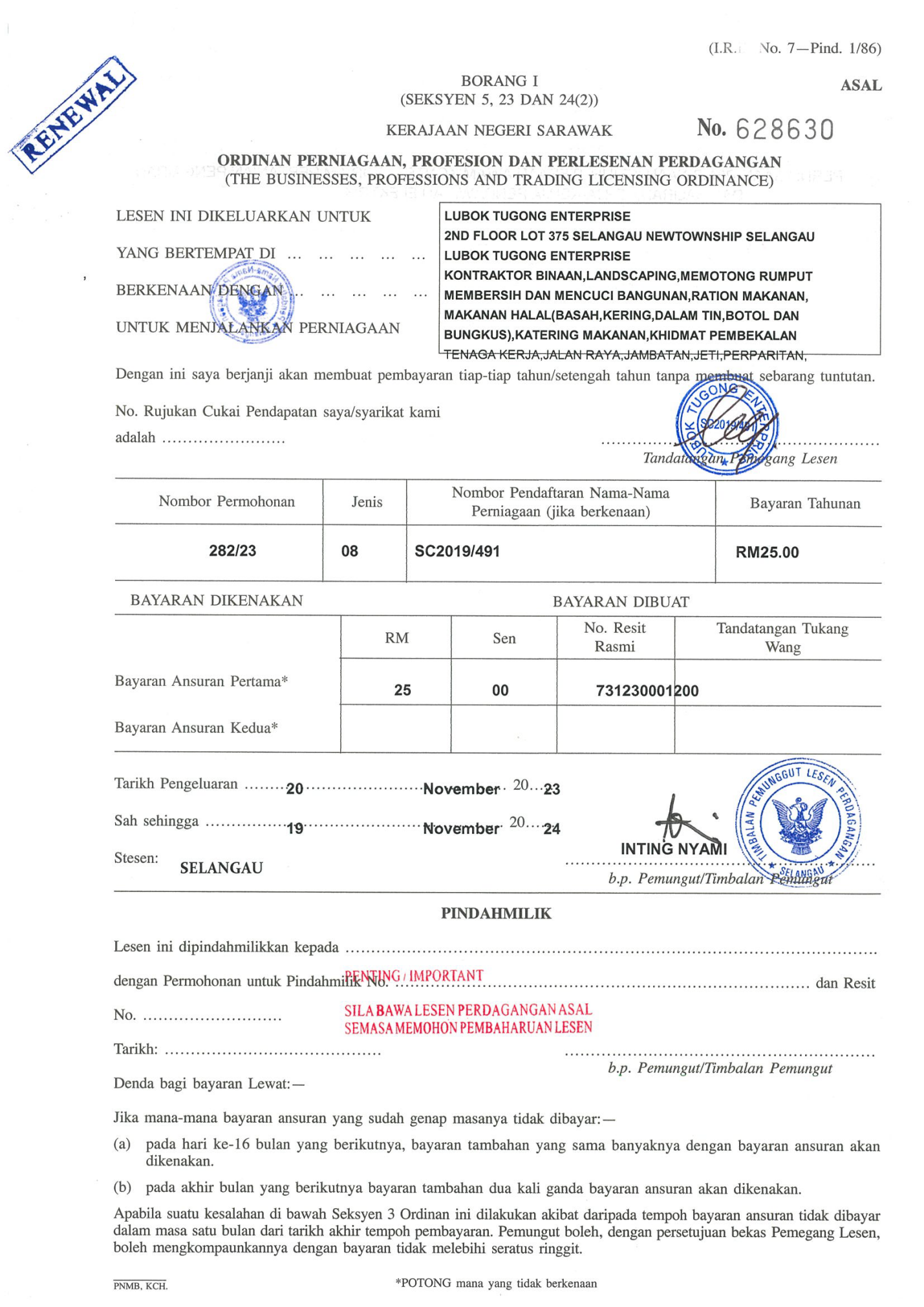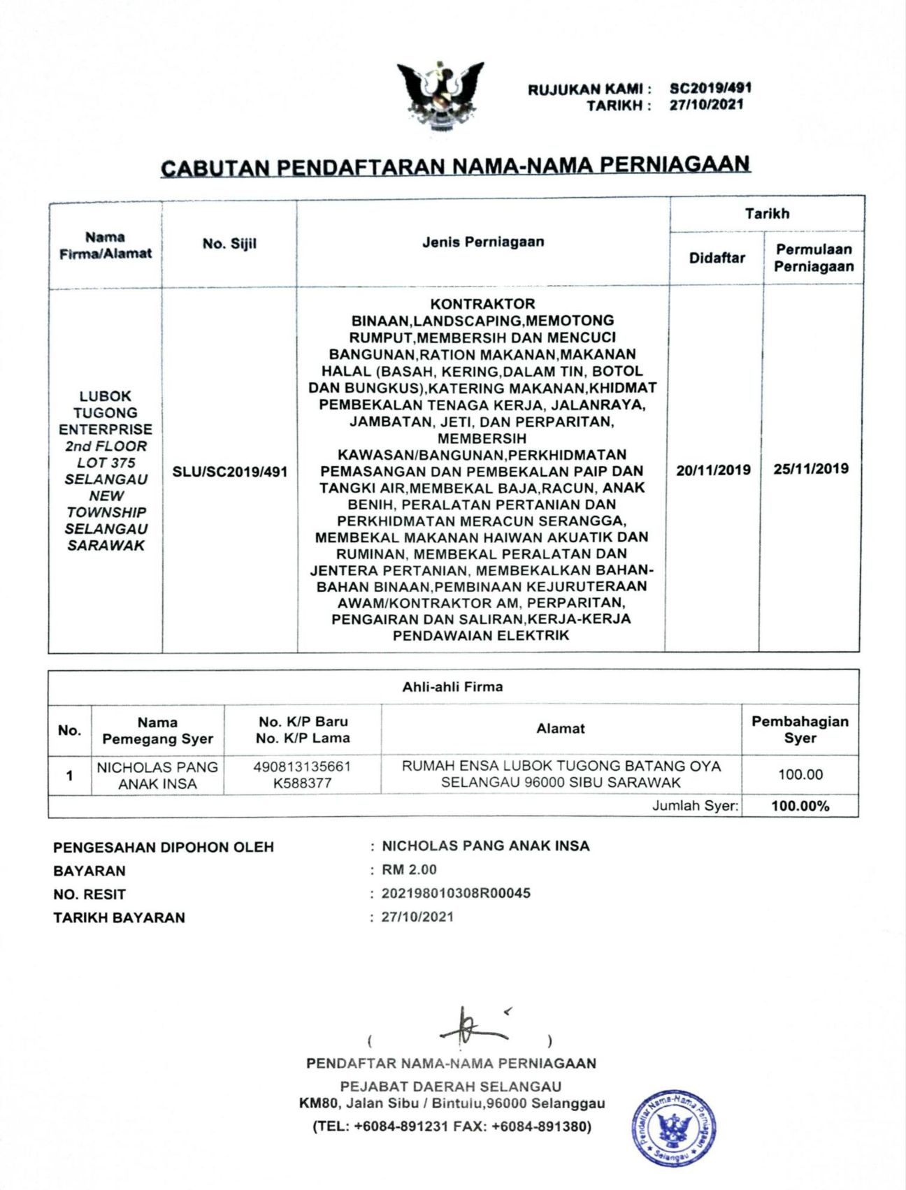 u In 2019 became a registered sole entrepreneur of nature business to provide constructions work, building maintenance and agriculture greenhouse structure services, HQ in Selangau, Sarawak.
